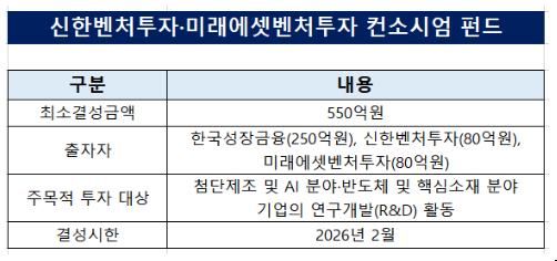 10일 VC업계에 따르면 신한벤처투자·미래에셋벤처투자 컨소시엄은 한국성장금융의 출자사업 '기술혁신전문펀드 6호' 첨단제조 AI·반도체·핵심소재 분야 GP로 선정됐다. 이는 양사의 첫 협업 사례다. 3.5대 1 경쟁률을 뚫고 엔베스터와 함께 이름을 올렸다.