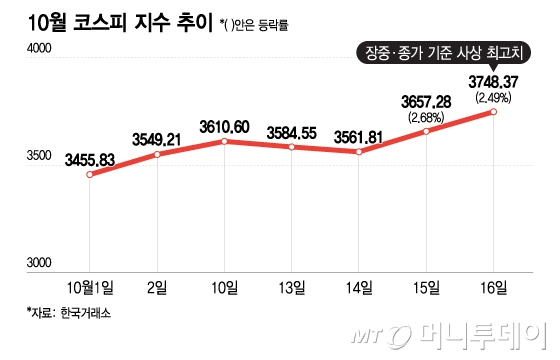 16일 코스피 지수는 전일 대비 91.09포인트(2.49%) 오른 3748.37에 마감했다. 외국인과 기관이 각각 6591억원어치, 7428억원어치를 순매수하며 지수 상승을 이끌었다. 개인은 1조3949억원어치를 순매도하며 대거 차익 실현에 나섰다.