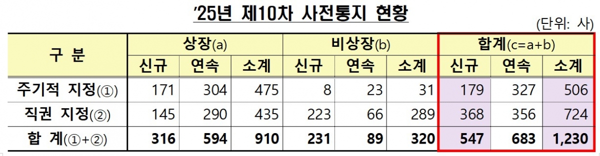 사전통지 대상 회사 중 코스피 기업은 257개사, 코스닥 626개사, 코넥스 27사 등이다. 547개사가 신규로 683개사는 2년차 이상 지정됐다.