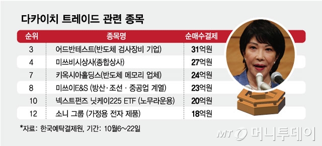 이 기간 어드반테스트가 상위 3위(218만6647달러·31억4900만 원)에 이름을 올렸다. 뒤를 이어 키옥시아(7위·163만3028달러), 미쓰이E&S(8위·158만9616달러), 소니(12위·122만6068달러) 등이 이름을 올렸다. 이들 기업은 반도체, AI, 방산, 조선 등의 산업군에 속한 기업으로, 다카이치 신임 총리가 내세우는 경제 안보 정책과 맞물려 있다.