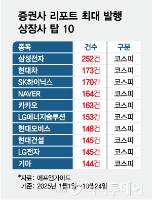 대표적으로 △삼성전자(218,000원 ▲14,500 +7.13%) 252건 △현대차(609,000원 ▲37,000 +6.47%) 173건 △ SK하이닉스(1,099,000원 ▲81,000 +7.96%) 170건 △NAVER(260,500원 ▲7,500 +2.96%) 164건 △ 카카오(61,400원 ▲4,000 +6.97%) 163건 등 코스피 시총 상위 10위권 기업에 리포트가 집중됐다. 반면 코스닥 대장주인 알테오젠(403,000원 ▲1,000 +0.25%)의 리포트 수는 18건에 불과했다. 삼성전자와 비교하면 14분의1 수준이다.