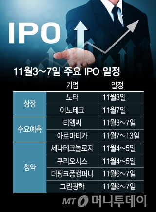 이번 주에는 앞선 일반 투자자 청약에서 대흥행을 거둔 노타와 이노테크가 코스닥 시장에 입성한다. 또 다양한 산업군의 기업이 수요예측과 일반 청약을 앞두고 있다.