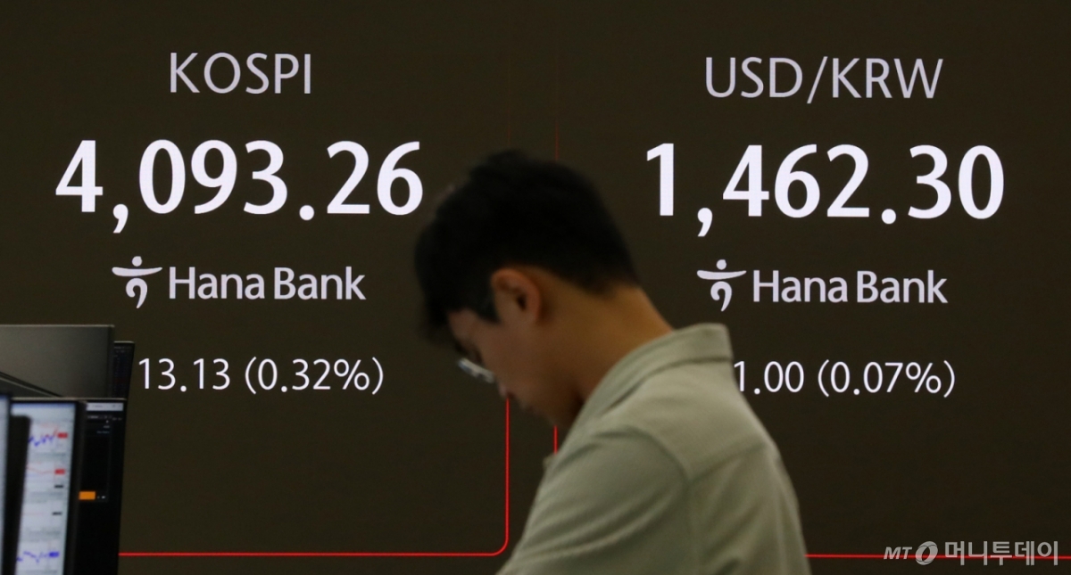 ![[서울=뉴시스] 김혜진 기자 = 코스피가 전 거래일(4106.39)보다 8.95포인트(0.22%) 하락한 4097.44에 개장한 12일 오전 서울 중구 하나은행 딜링룸 전광판에 지수가 표시 되고 있다. 코스닥 지수는 전 거래일(884.27)보다 6.72포인트(0.76%) 오른 890.99에 거래를 시작했다. 원·달러 환율은 전 거래일 주간거래 종가(1463.3원)보다 2.3원 내린 1461.0원에 출발했다. 2025.11.12. jini@newsis.com /사진=김혜진](https://thumb.mt.co.kr/cdn-cgi/image/f=avif/21/2025/11/2025111209144754921_1.jpg)