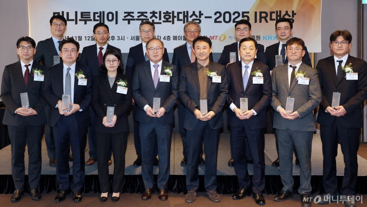 12일 서울 중구 더 플라자 호텔에서 열린 '머니투데이 주주친화대상-2025 IR 대상'에서 시상자와 수상자들이 기념촬영을 하고 있다.