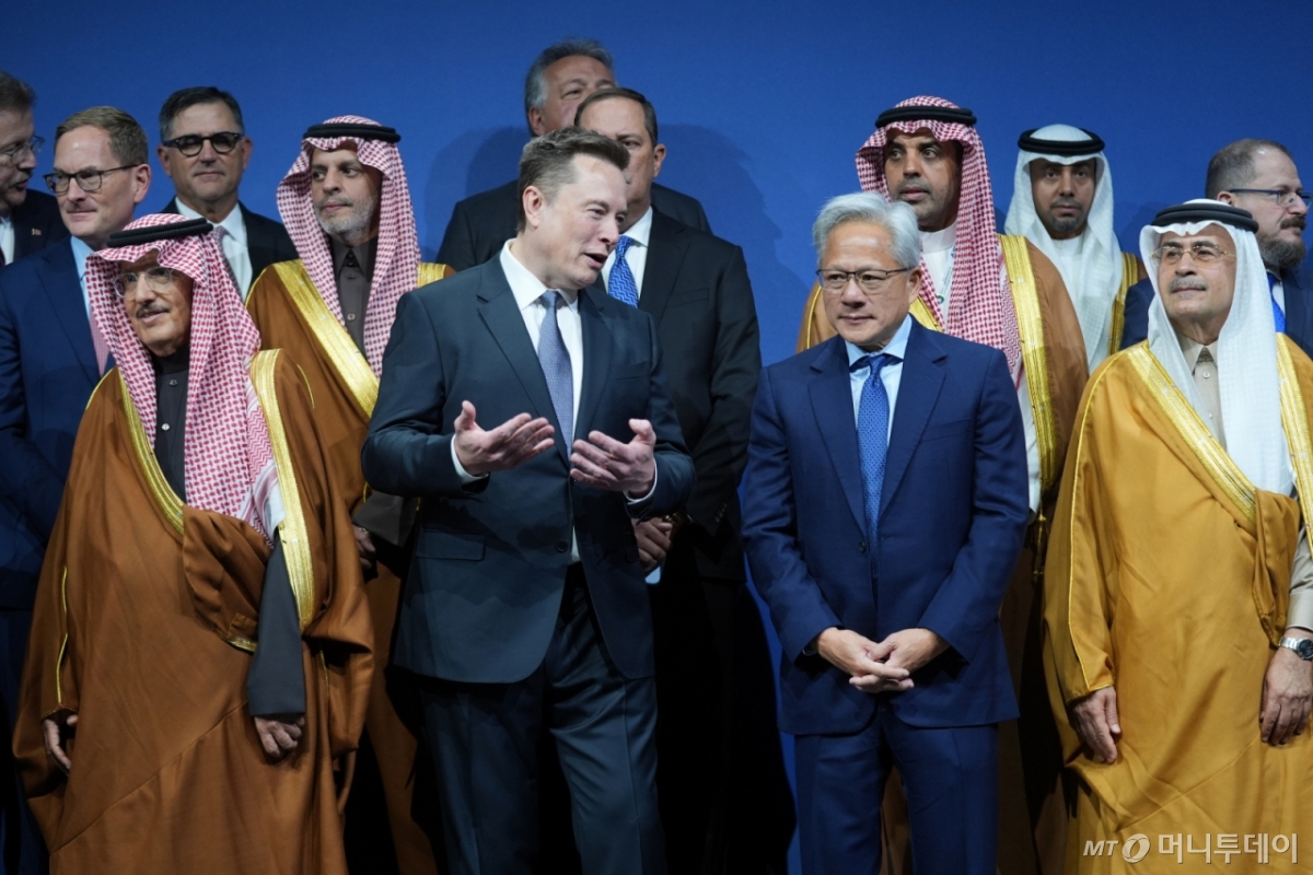 ![[워싱턴=AP/뉴시스] 일론 머스크(왼쪽) 테슬라 최고경영자와 젠슨 황 엔비디아 최고경영자가 19일(현지 시간) 워싱턴 케네디 센터에서 열린 미국-사우디 투자 포럼에 참석해 기념 촬영하면서 얘기를 나누고 있다. 2025.11.20. /사진=민경찬](https://thumb.mt.co.kr/cdn-cgi/image/f=avif/21/2025/11/2025112009141990117_1.jpg)