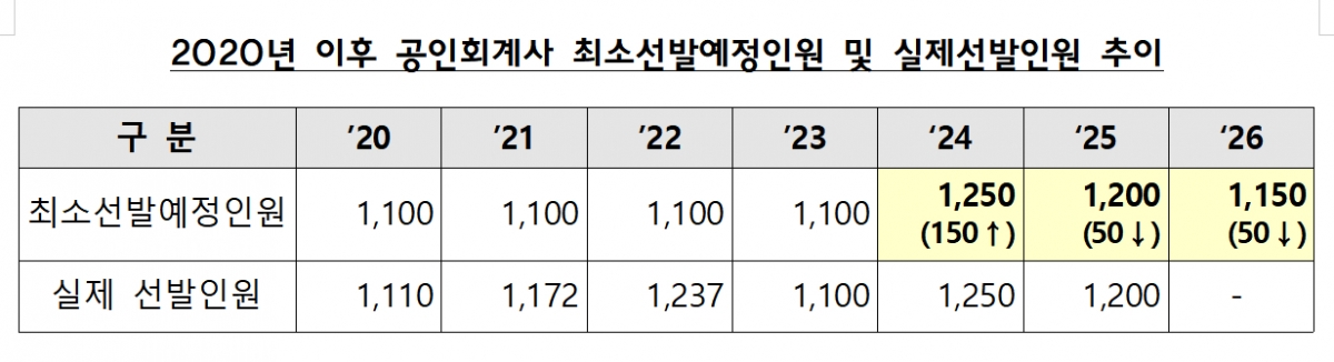 공인회계사 최소선발예정인원은 2020~2023년 1100명이었으나 비회계법인의 회계사 채용수요 등을 고려해 2024년은 1250명, 2025년은 1200명으로 확대한 바 있다.