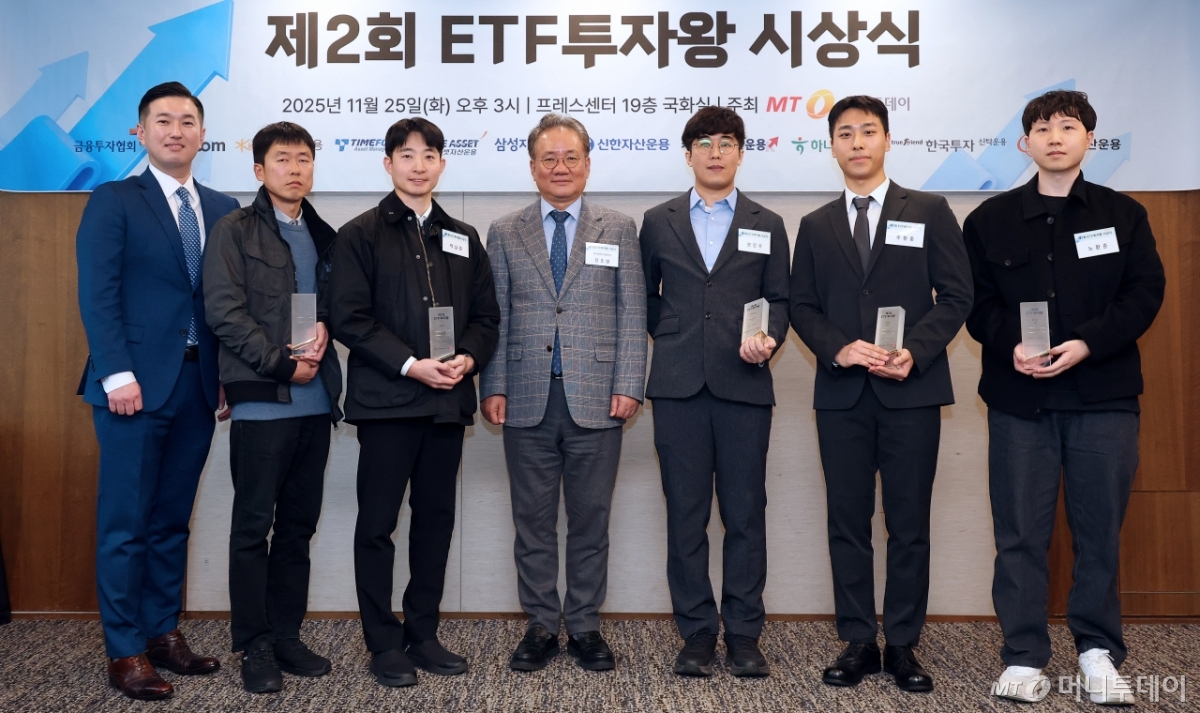 25일 서울 중구 프레스센터에서 진행된 머니투데이 주최 '제2회 ETF 투자왕' 시상식에서 시상자 및 수상자들이 기념촬영을 하고 있다. 왼쪽부터 김도형 삼성자산운용 ETF컨설팅본부장, 이성동씨(닉네임 마이더스6), 박남준(닉네임 남준), 강호병 머니투데이 대표, 전진우씨(닉네임 비서실장), 주원중씨(닉네임 깐부통닭), 노환준씨(닉네임 노환준). 독자들의 PICK! 허니문 베이비 '출생의 비밀'...결혼 직전 전남친 만난 아내 "룸 요청, 여성 픽업까지"…톱배우 전 매니저 "증거 있어" 갑질 폭로 임신한 고3 아내에 "살찌면 죽일 것" 막말…부부관계 중 게임까지 소유, 임영웅과 '제주도 열애설' 전말 공개
