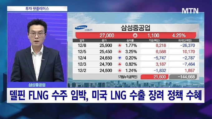 김성준의 핫플레이스 프로그램에서 쓰리빌리언의 내년 흑자전환 기대, 삼성중공업의 MRO, 군수지원함 등 관련 수주 기대, 에스티아이의 전력반도체 장비 수주 소식을 다루었습니다. 특히 삼성중공업은 델핀 FLNG 수주 임박과 미국 LNG 수출 장려 정책 수혜로 주목받고 있으며, 현재가 24,000원, 목표가 32,000원, 손절가 24,000원으로 제시되었습니다.