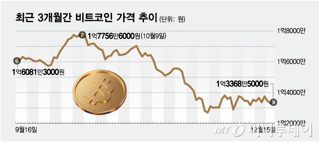15일 코인마켓캡에 따르면 이날 오전 8시30분쯤 비트코인 가격은 8만8000달러(1억2950만원)선이 무너졌다. 10월 초 12만7000달러까지 갔던 가격이 2개월여만에 30% 하락한 것이다. 김치 프리미엄이 반영된 원화 기반 비트코인 가격도 상황은 마찬가지다. 최근 3개월 원화 기준 비트코인 가격은 10월 초 1억8000만원 고지를 눈앞에 뒀다가 이후 2개월 이상 내리막길을 걷고 있다.
