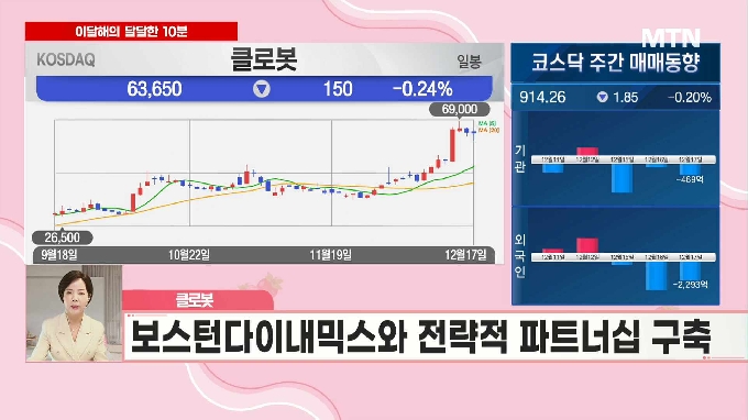 이달해 주식명가 MTN W 어드바이저가 실시간 종목 검색 상위 TOP10을 소개하며, 클로봇, 현대무벡스, 퓨런티어 등의 종목을 언급했습니다. 자율주행차 센싱카메라 공정장비 전문기업과 테슬라의 무인 로보택시 시험 주행에 대한 내용도 포함되어 있으며, 아우토크립트와 에스투더블유의 주가 상승 사례를 언급했습니다.
