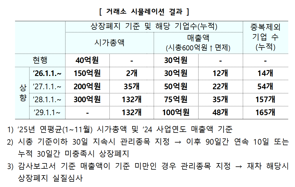 시가총액 상장폐지 요건도 1월부터 확대된다. 시총이 현 40억원에서 단계적으로 150억원 미만이면 상폐 요건에 해당하게 된다. 시뮬레이션 결과 내년 14개사가 상장폐지 요건에 해당하지만 기준 상향조정이 마무리되는 2029년은 코스닥 상장기업의 9.5%인 165개가 상폐 요건에 해당하게 된다.