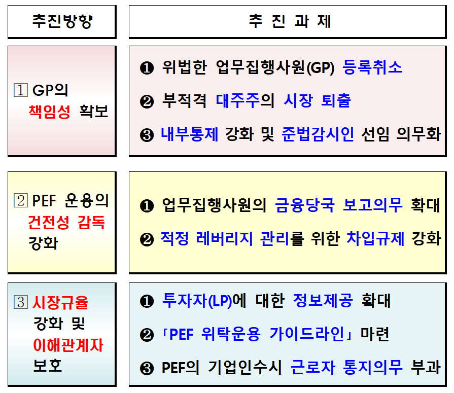 부적격 사모펀드 대주주의 시장 퇴출에 대한 근거도 선진국 기준을 따랐다. 미국은 GP의 등록자격을 판단할 때 대주주의 10년간 민형사 행정법규 위반 이력을 중요하게 본다. 유럽은 10% 이상 보유주주에 대해 운용사 건전 경영 여부 평가항목이 있다.