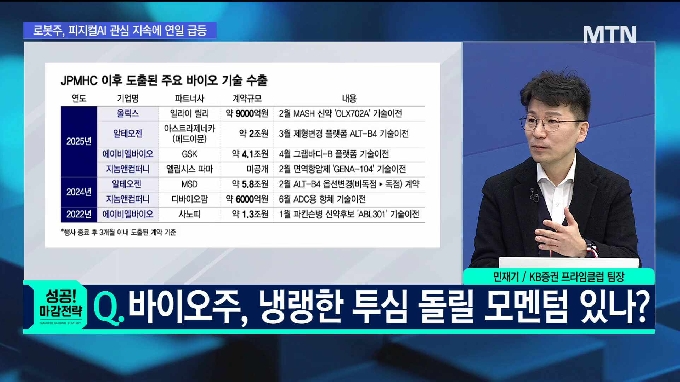 출연 : 민재기 팀장 / KB증권 프라임클럽 바이오주 Q. 알테오젠, 기술이전 규모 실망감에 비실 보유자 대응은? Q. 삼바, 영업익 첫 2조 돌파 올해도 성장 이어갈까? Q. 바이오주, 냉랭한 투심 돌릴 모멘텀 있나? 반도체 장비주Q. 삼성전자, 이제는 '천조전자' 20만원 돌파 전 매수할까? Q. 다음주 반도체 기업 대거 실적 발표 주목할 포인트는? 문제적 섹터 톱픽 - SK하이닉스향 TC본더 점유율 확대 기대- M15X팹 HBM 장비 입고 집중 시기- 기관 수급 유입, 수주 계약 임박 신호로 해석* 25/12/4 HL만도 38.4% (최고가 기준) 이 방송은 매일 13시 00분 ~ 15시 41분에 LIVE로 시청하실 수 있습니다. 방송 종료 후에는 유튜브 또는 인터넷 다시보기로 시청하실 수 있습니다.시청 방법 머니투데이방송 홈페이지 유튜브 MTN 머니투데이방송 공식 채널 ( MTN 또는 머니투데이방송 검색) 케이블TV 및 Btv 152번, GENIEtv 181번, U tv 163번, 스카이라이프 152번 Wavve, 쿠팡플레이, 네이버 TV, 카카오TV
