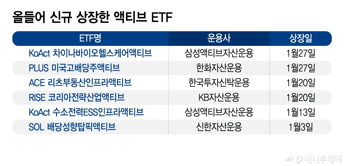액티브 ETF에 대한 수요가 증가하면서 액티브 ETF의 신규상장도 이어진다. 올들어 새로 상장한 액티브 ETF는 6개로 전체 신규상장 ETF(10개) 중 절반 이상을 차지했다. 특히 업종, 배당, 국가전략산업, 리츠(REITs·부동산투자신탁) 등 다양한 테마의 ETF가 액티브 운용방식으로 상장했다. 'KoAct 차이나바이오헬스케어액티브' 'PLUS 미국고배당주액티브' 'ACE 리츠부동산인프라액티브' 'RISE 코리아전략산업액티브' 'KoAct 수소전력ESS인프라액티브' 'SOL 배당성향탑픽액티브' 등이다.