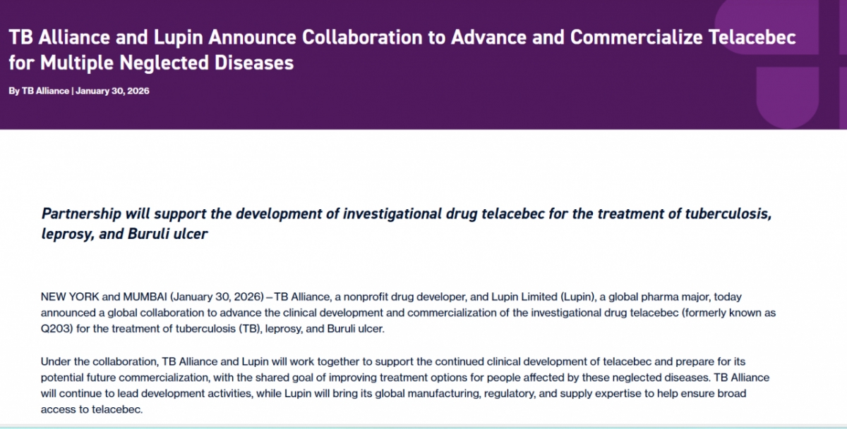 TB 얼라이언스는 지난 1월 30일 인도 최대 제약사 중 하나인 루핀(Lupin)과 텔라세벡의 상용화를 위한 협약을 체결했다. 이번 협력은 결핵(TB) 및 나병(한센병), 부룰리궤양(Buruli ulcer) 등 소외 감염병을 대상으로 텔라세벡의 임상 개발과 제품 공급을 가속화하는 것이 골자다.