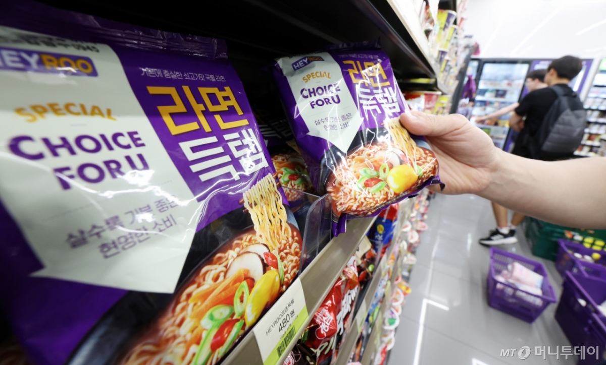 ![[서울=뉴시스] 조성우 기자 = 25일 서울의 한 CU 편의점에서 시민이 CU 자체브랜드(PB) 상품인 '득템 라면'을 살펴보고 있다. 물가 상승으로 최근 편의점에서 초저가 상품을 찾는 수요가 증가하고 있다. BGF리테일에 따르면 CU의 초저가 상품인 '득템 라면'은 이달 (1~22일) 매출이 37.5% 증가했다. CU의 1900원 득템 닭가슴살의 매출은 전년 대비 77.6%나 올랐다. CU 자체 커피 브랜드 '겟커피'는 올해 1~5월 매출이 전년 동기 대비 15% 올랐다. 2025.06.25. xconfind@newsis.com /사진=조성우](https://thumb.mt.co.kr/cdn-cgi/image/f=avif/21/2026/02/2026021109104622207_1.jpg)