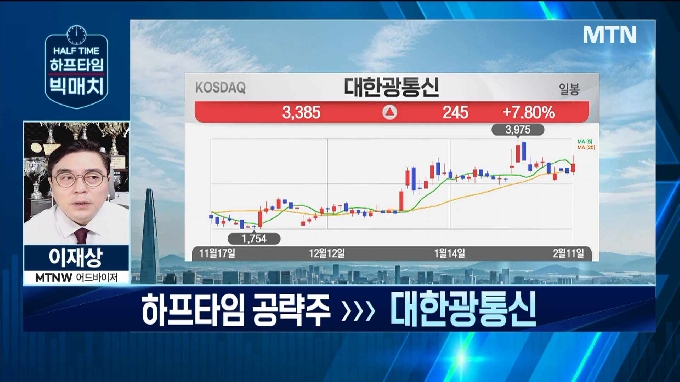 오늘의 하프타임 공략주로 대한광통신이 소개되었습니다. 매수가는 현재가 4,950원, 목표가는 4,950원, 손절가는 3,100원입니다.