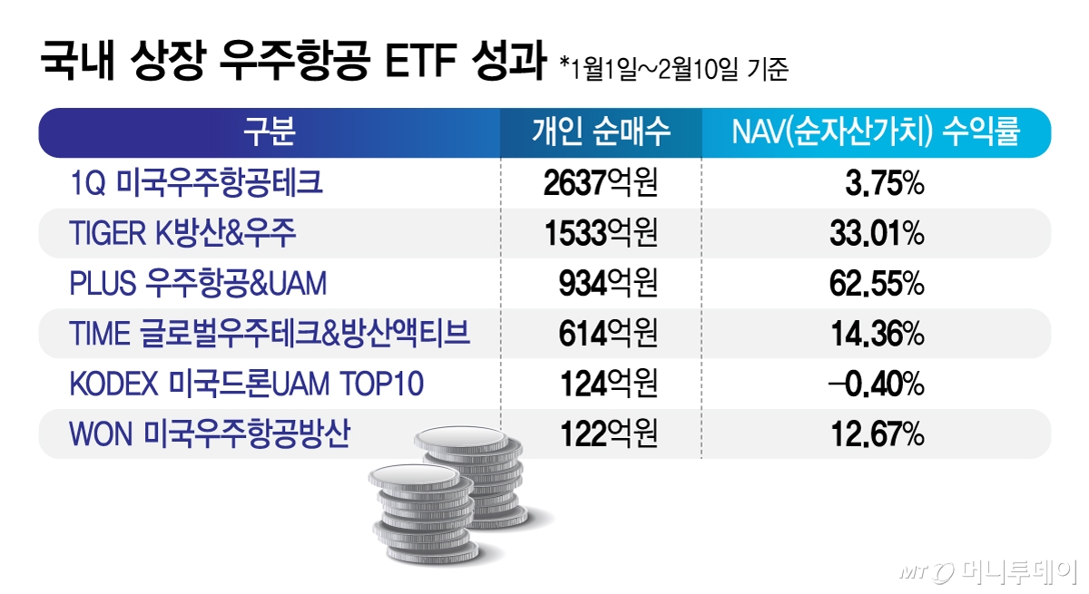 두번째로 개인순매수가 컸던 상품은 1533억원을 기록한 미래에셋자산운용의 TIGER K방산&우주(39,540원 ▼65 -0.16%)다. 이어 한화자산운용의 PLUS 우주항공&UAM(43,185원 ▲415 +0.97%)(934억원), 타임폴리오자산운용의 TIME 글로벌우주테크&방산액티브(22,305원 ▼250 -1.11%)(614억원), 삼성자산운용의 KODEX 미국드론UAMTOP10(124억원), 우리자산운용의 WON 미국우주항공방산(26,855원 ▼330 -1.21%)(122억원)이었다.