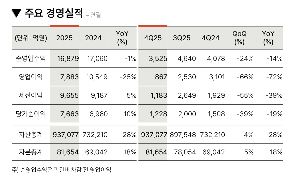 메리츠증권은 2025년도 연결 기준 당기순이익은 전년 대비 10.1% 증가한 7663억원을 기록했다고 11일 밝혔다. 같은 기간 영업이익은 25% 감소한 7883억원, 순영업수익은 1% 감소한 1조6879억원이었다.