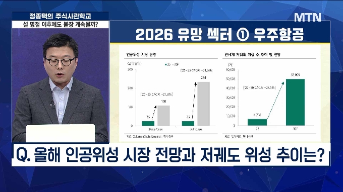 * 든든한 모멘텀· 충분한 상승 여력 보유한 섹터는?- 올해 인공위성 시장 전망과 저궤도 위성 추이는?- 지금 우주항공 섹터에 주목해야 하는 이유- 인공위성부터 특수 소재까지 우주항공 관심주는?- 산업용 로봇 시대 개막 글로벌 시장 규모는?- 대기업 휴머노이드 로봇의 등장 관전 포인트는?- 글로벌 의료 로봇 시장 전망과 현 점유율 추이는?- 다양한 테마 파생 지켜봐야 할 로봇 관심주는?시청 방법 머니투데이방송 홈페이지 유튜브 MTN 머니투데이방송 공식 채널 ( MTN 또는 머니투데이방송 검색) 케이블TV 및 Btv 152번, GENIEtv 181번, U tv 163번, 스카이라이프 152번 Wavve, 쿠팡플레이, 네이버 TV, 카카오TV 생방송 는 매주 화요일 오후 5시 30분에 방송되며, 이 방송은 머니투데이방송홈페이지 및 케이블방송에서 라이브로 시청하실 수 있습니다. 또한 방송 종료 후에는 머니투데이 방송홈페이지와 Youtube를 통해 다시보기로 시청하실 수 있습니다.