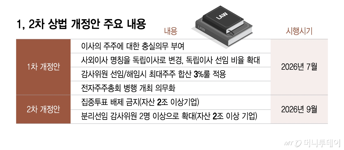 이번 주주총회는 오는 7월과 9월에 시행되는 1, 2차 상법개정안이 반영되기 전 마지막 주주총회다. 7월 시행예정인 1차 상법개정안은 이사의 주주에 대한 충실의무가 명문화됐고 감사위원 선임안건에 최대주주와 특수관계인 의결권을 3% 이하로 제한하는 '3%룰', 전자주총 병행 의무화 등이 반영됐다. 2차 상법개정안은 집중투표제 의무화와 감사위원 분리선출 확대가 골자다.