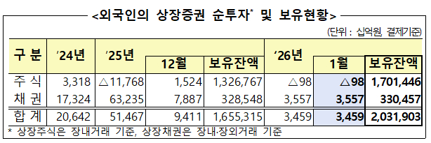 13일 금융감독원이 발표한 '2026년 1월 외국인 증권투자 동향'에 따르면 외국인은 상장주식 980억원어치를 순매도했다. 코스피 시장에서 3610억원어치를 사들이고 코스닥에서 4590억원어치를 내다 팔았다. 지난해 12월 1조5000억원어치를 매수하며 순매수세로 전환한 지 한달 만에 다시 순매도로 돌아섰다. 지난달 사상 처음으로 코스피는 5000, 코스닥은 1000을 돌파하면서 차익실현을 위해 주식을 내다 판 결과로 분석된다.