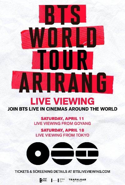하이브(389,000원 ▲8,500 +2.23%) 뮤직그룹 레이블 빅히트 뮤직에 따르면 4월 11일 고양과 18일 일본 도쿄에서 열리는 '방탄소년단 월드투어 아리랑'(BTS WORLD TOUR 'ARIRANG') 공연을 라이브 뷰잉(Live Viewing)으로 감상할 수 있다. 라이브 뷰잉은 수많은 관객이 하나의 장소에 모여 콘서트나 스포츠 경기 등을 함께 관람하는 중계 서비스다.