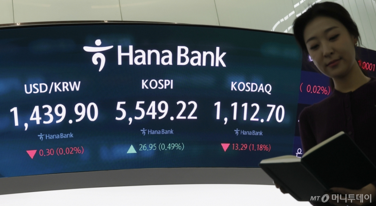 ![[서울=뉴시스] 김혜진 기자 = 코스피가 전 거래일(5522.27)보다 8.56포인트(0.16%) 내린 5513.71에 개장한 3일 오전 서울 중구 하나은행 딜링룸 전광판에 지수가 표시 되고 있다. 코스닥 지수는 전 거래일(1125.99)보다 12.46포인트(1.11%) 내린 1113.53에 거래를 시작했다. 원·달러 환율은 전 거래일 주간거래 종가(1440.2원)보다 1.3원 오른 1441.5원에 출발했다. 2026.02.13. jini@newsis.com /사진=김혜진](https://thumb.mt.co.kr/cdn-cgi/image/f=avif/21/2026/02/2026021310044280053_1.jpg)
