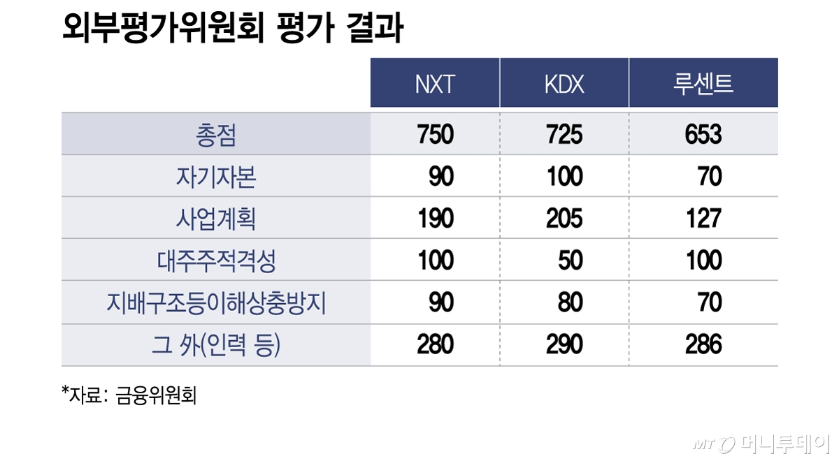 금융위는 외부평가위원회(외평위) 평가결과를 토대로 점수가 높은 2개사인 NXT 컨소와 KDX에 예비인가를 내주기로 했다. 외평위 평가 결과 NXT 컨소가 750점, KDX 725점으로 각각 1·2위를 차지했다. 루센트블록은 653점으로 3위였다. 루센트블록 평가점수는 1등과 97점, 2등과는 72점 각각 차이가 난다.