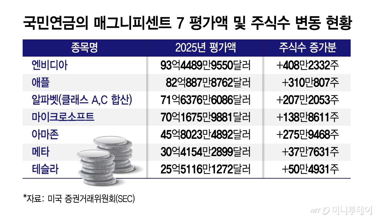 국민연금의 매그니피센트 7 평가액 및 주식수 변동 현황/그래픽=김지영