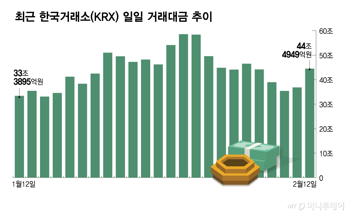 일일거래대금도 다소 가라앉았다. 12일 기준 넥스트레이드를 제외한 한국거래소(이하 거래소)의 코스피와 코스닥 거래대금은 44조4925억원으로 과열양상이던 지난달 29일과 30일 58조원 규모에서 약 8조원 빠졌다. 11일과 10일엔 30조원대에 머물렀다.