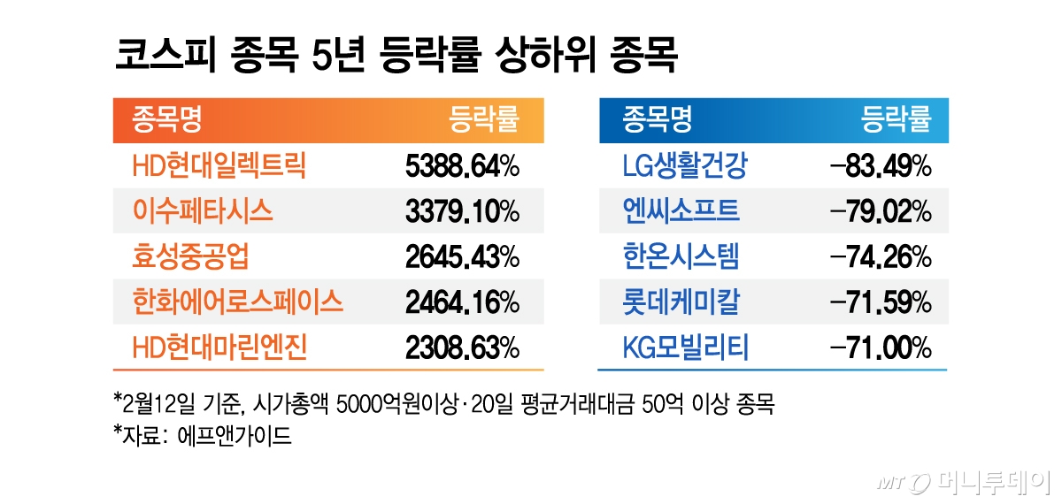같은 기간 코스피 상장 종목(시가총액 5000억원 이상·20일 평균 거래대금 50억원 이상) 중 상승률이 가장 높은 종목은 HD현대일렉트릭이다. 5년 전 1만7600원이었던 주가는 지난 12일 5388.65% 상승한 96만6000원을 기록했다.