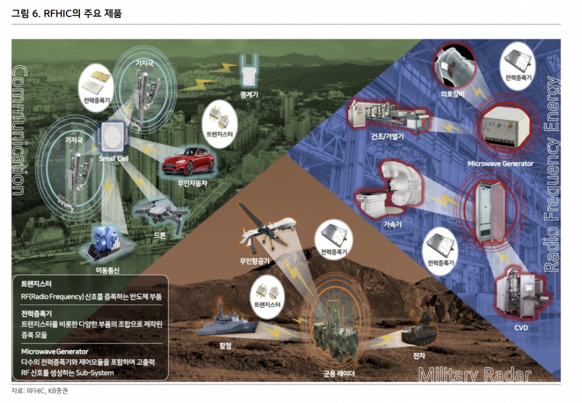 이 연구원은 "해외 방산 부문의 누적 수주가 폭발적으로 증가하고 있어 '실적 깡패 방산주'로서 주목받을 전망이며, 통신장비 분야에서도 경쟁사인 NXP의 사업 철수에 따른 반사이익이 신규 고객 확보 등 유효한 결과로 나타날 것"이라고 했다. KB증권은 지난해 54.4%였던 RFHIC의 방산 매출 비중이 올해 66%까지 확대될 것으로 내다봤다.