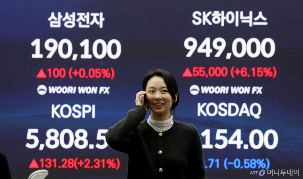코스피가 5,800선을 돌파한 20일 서울 중구 우리은행 딜링룸에 종가가 보이고 있다. 코스피는 전 거래일(5677.25)보다 131.28포인트(2.31%) 오른 5808.53에, 코스닥 지수는 전 거래일(1160.71)보다 6.71포인트(0.58%) 하락한 1154.00에 거래를 마쳤다. /사진=뉴시스