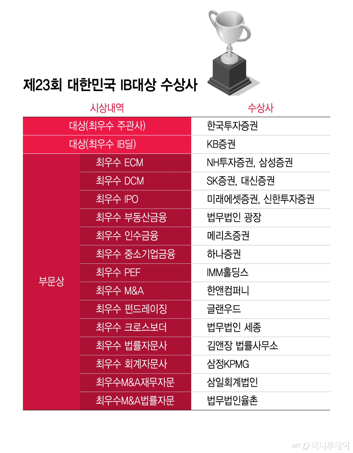 머니투데이가 주최하고 금융위원회, 한국거래소, 금융투자협회, 자본시장연구원이 후원하는 '제23회 대한민국 IB(투자은행) 대상'에서 종합 대상인 '최우수 주관사(House of the Year)'에 한국투자증권, '최우수 IB 딜(Deal of the Year)'에 KB증권이 각각 선정됐습니다.
