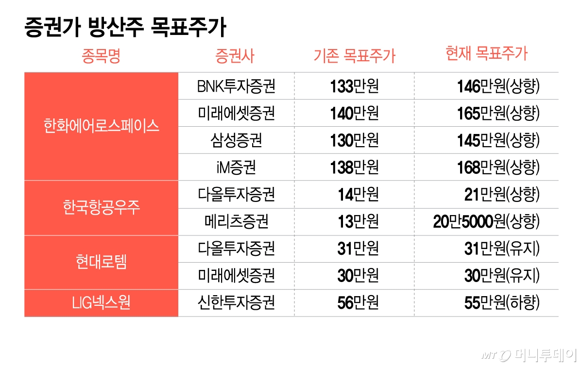 현재 방산주 중에서 유일하게 100만원을 넘긴 한화에어로스페이스는 올해 들어서도 목표주가 상향이 이어지고 있다. 지난해 4분기 실적은 다소 부진했지만 올해 수출 모멘텀을 고려하면 실적 개선이 기대된다는 이유에서다.