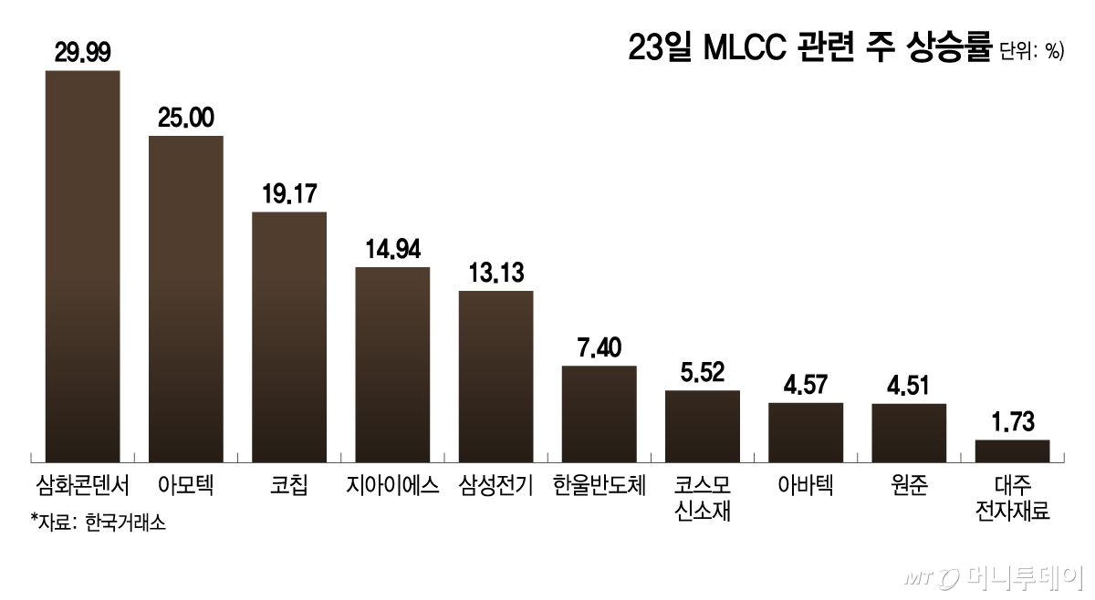 AI(인공지능) 산업 성장으로 반도체에 이어 MLCC(적층세라믹콘덴서)가 수혜를 받을 것이란 전망이 나오면서 관련 주들이 들썩였다.