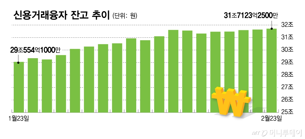 25일 금융투자협회에 따르면 지난 23일 기준 신용거래융자 잔고는 31조7123억원으로 사상 최고치다. 코스피는 21조1214억원, 코스닥은 10조5908억원을 기록했다. 사상 첫 장중 코스피 5000을 달성한 지난 22일 이후로 신용거래융자 잔고는 한 달 사이 2조6569억원 넘게 불어났다.