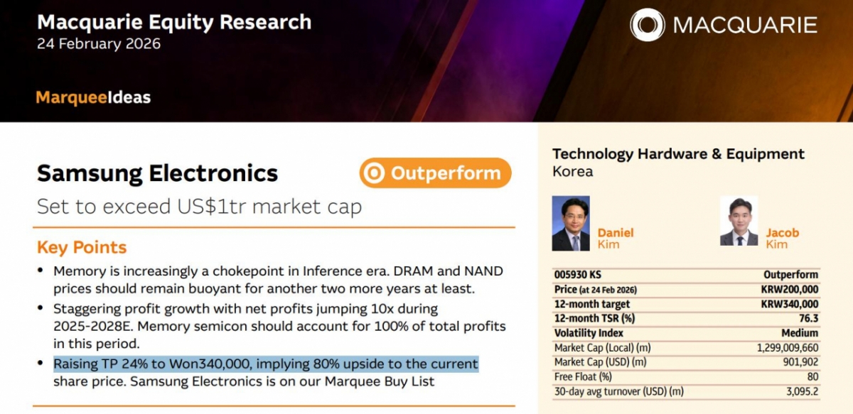 맥쿼리증권이 삼성전자와 SK하이닉스의 실적 전망치를 대폭 높여 잡으며 목표주가를 34만원, 170만원으로 각각 상향 조정했다.