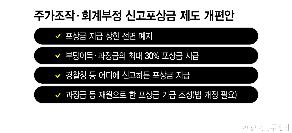 우선 금융당국은 주가조작·회계부정 신고 포상금 지급상한을 없앤다. 지금까지 포상금 상한액은 불공정거래가 30억원, 회계부정이 10억원이었다. 주가조작 등이 갈수록 지능화하면서 내부자의 정보제공이 결정적 역할을 할 수 있으나 내부고발자 입장에선 신고에 따른 위험부담 대비 보상이 충분하지 않아 신고할 유인이 적다는 지적이 있었다.
