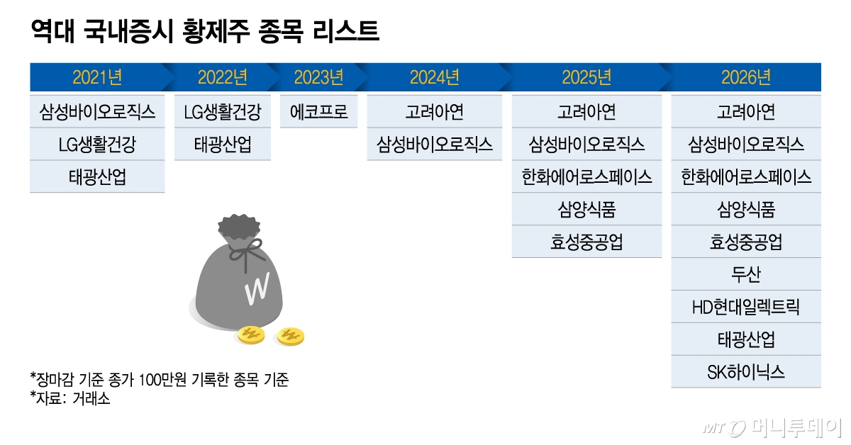 25일 한국거래소에 따르면 올해 들어 종가 기준으로 황제주에 오른 종목은 고려아연(2,115,000원 ▲244,000 +13.04%), 삼성바이오로직스(1,728,000원 ▲5,000 +0.29%), 한화에어로스페이스(1,212,000원 ▼29,000 -2.34%), 삼양식품(1,243,000원 ▲11,000 +0.89%), 효성중공업(2,763,000원 ▲5,000 +0.18%), 두산(1,165,000원 ▲64,000 +5.81%), HD현대일렉트릭(1,065,000원 ▼5,000 -0.47%), 태광산업(1,500,000원 ▲301,000 +25.1%), SK하이닉스(1,018,000원 ▲13,000 +1.29%) 등 9개 종목으로 집계됐다. 코스피가 처음 3000선을 돌파했던 2021년과 비교해서는 세배 수준으로 늘었다. 지난해 4000선을 넘어선 코스피가 올해 들어서도 가파른 상승 흐름을 이어가며 황제주 숫자는 빠르게 늘고 있다.