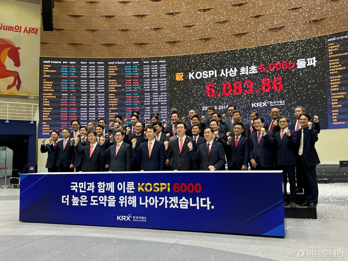 거래소는 25일 서울 사옥 홍보관에서 6000포인트 돌파 기념식을 열었다. 정은보 거래소 이사장은 이날 행사에서 "지난달 27일 코스피가 5000을 돌파한 지 채 한달도 되지 않아 코스피 6000포인트 돌파라는 쾌거를 이뤘다"며 "코스피가 지난해부터 글로벌 주요국 증시에서 가장 우수한 성과를 보이는건 국내 자본시장이 변화하고 있고 산업경쟁력이 개선되고 있음을 방증한다"고 말했다.