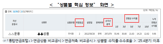 우선 상품별 핵심 정보를 제공한다. 적립금(펀드는 순자산총액)·수익률 정보를 제공해 소비자들이 시장에서 검증된 실적 좋은 상품을 비교·선택할 수 있도록 했다. 펀드·ETF 상품에는 위험등급 정보를 추가해 상품 위험 수준을 직관적으로 파악하고 투자성향에 맞는 상품을 고를 수 있도록 했다.
