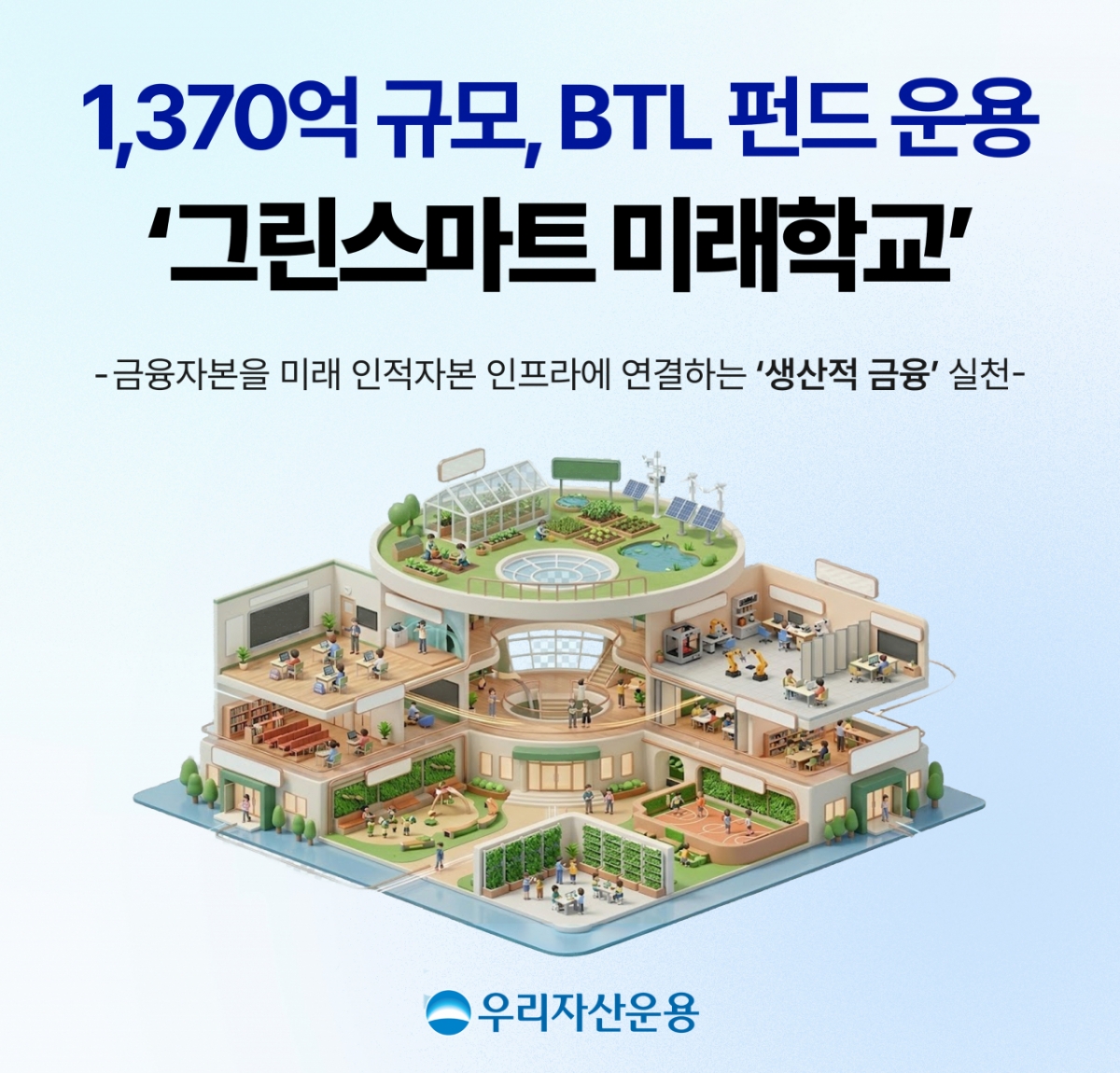 우리자산운용은 노후된 학교를 디지털·친환경 기반의 '그린스마트 미래학교'로 바꾸는 교육인프라 장기 프로젝트에 참여, 1370억원 규모 교육 인프라 펀드 운용을 맡는다고 3일 밝혔다.