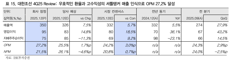 대한조선의 4분기 연결 매출은 전분기 대비 27.9% 증가한 3504억원, 영업이익은 43.2% 늘어난 953억원을 기록했다. 우호적인 환율 효과와 셔틀탱커 매출 인식이 본격화되며 매출 성장과 수익성 개선이 동시에 진행됐단 분석이다.