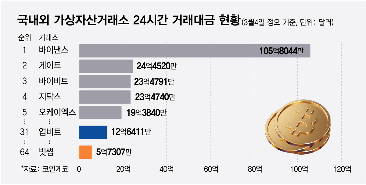 빗썸은 5억7307만달러로 64위, 코빗은 4573만달러로 77위에 올랐다. 고팍스는 137위, 코인원은 145위로 집계됐다.