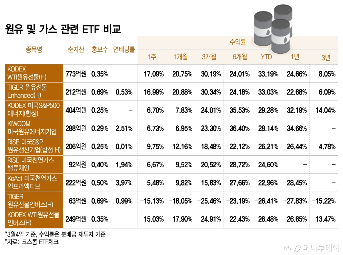 미국과 이스라엘의 이란 공습으로 인해 국제유가가 치솟으면서 원유와 가스 관련 ETF(상장지수펀드)에 관심이 높아지고 있다.
