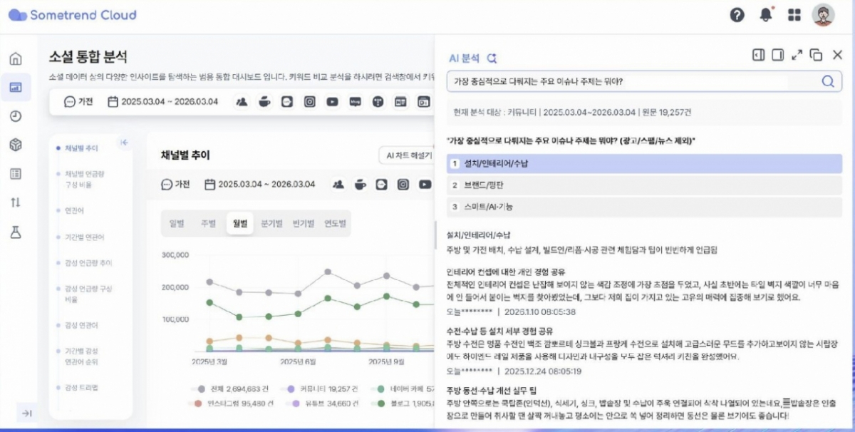 썸트렌드 AI는 소셜데이터 분석에 특화된 구조를 기반으로 트렌드 확산 배경과 반응 맥락, 급변하는 소비자 반응 등을 파악할 수 있도록 설계됐다.
