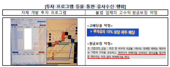최근 적발된 사례는 불법 업자가 자체 제작한 가짜 금융투자 프로그램을 이용한 유사수신 행위다. 가짜 자동매매 프로그램으로 주식·주가지수선물 등에 투자하면 투자금의 10%를 매주 배당해주고 원금까지 보장한다며 투자자를 유혹했다. 하지만 약속한 배당금이 지급되지 않아 이를 요구하거나 투자금 회수를 요청하면 불법업자는 거절하거나 잠적했다.