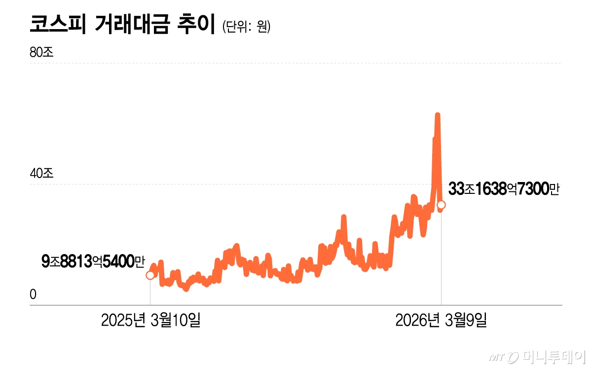 10일 한국거래소 등에 따르면 이달들어 9일까지 코스피 일평균 거래대금은 41조6000억원으로 지난달 기록한 일평균 거래대금 32조2000억원을 넘어 사상 최고 수준을 기록하고 있다. 코스피 지수가 12% 넘게 하락한 4일에는 62조9000억원으로 급증했다. 거래가 늘어나면서 코스피 회전율도 크게 상승 중이다. 3월 들어 일평균 코스피 회전율은 2.2%로 지난달(1.7%) 대비 높아졌다. 회전율은 일정기간 거래량을 상장주식 수로 나눈 값으로 높을수록 주식 손바뀜이 자주 일어났다는 의미다.